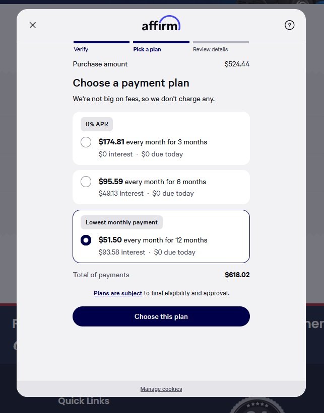 Your rate will be 0% APR or 10-30% APR. For example, a $800 purchase might cost $73/mo over 12 months at 15% APR. Payment options through Affirm are subject to an eligibility check, may not be available in all states, and are provided by these lending partners: affirm.com/lenders. Options depend on your purchase amount, and a down payment may be required. CA residents: Loans by Affirm Loan Services, LLC are made or arranged pursuant to a California Finance Lenders Law license.