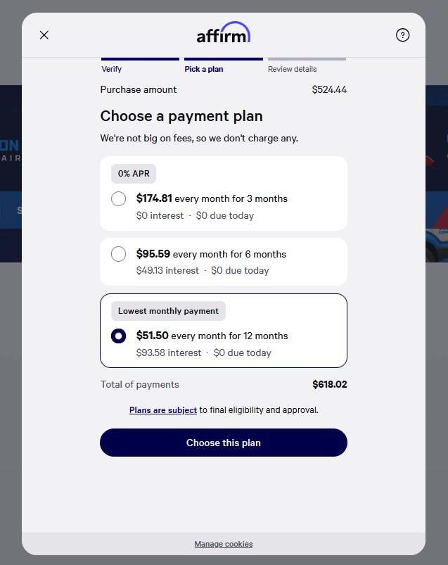 When it’s time to close the deal, Affirm financing helps you say yes, without relinquishing financial control. Select Affirm at checkout to pay over time, and never pay a dime more than you agreed to on the first day.